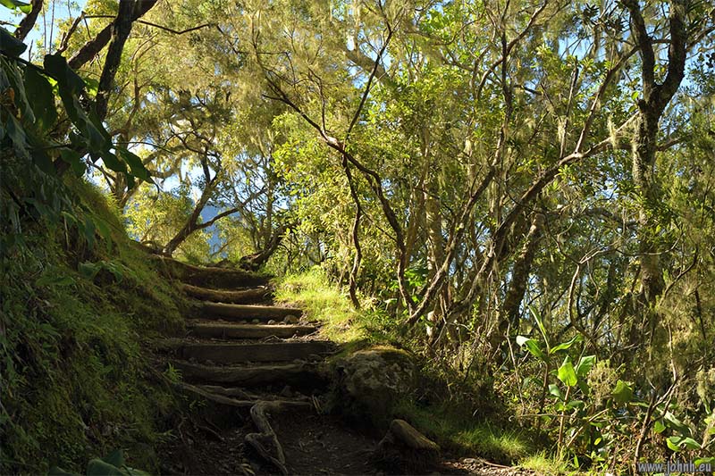 Hiking up the inside of the volcanic crater from the town of Cilaos on the GR R1 long-distance hiking route. This, the Forêt du Grand Matarum, is primal tropical forest, never harvested. But all the species have arrived from somewhere since the volcano went quiet so there’s a hotchpotch of trees and plants we know from Europe plus many from elsewhere.